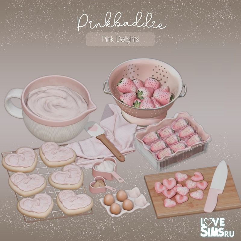Декор из кухонной утвари и продуктов в розовых и бежевых тонах, создающая впечатление процесса приготовления романтических десертов.