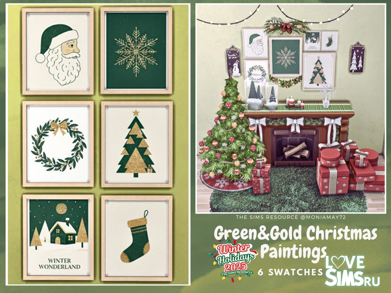 Шесть картин с рождественской тематикой в зелёно‑золотой палитре. Оригинальное название Green&Gold Christmas Paitings от Moniamay72.