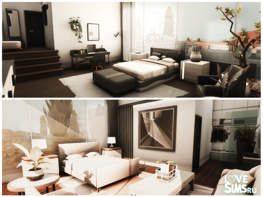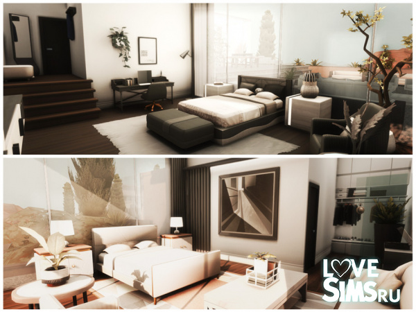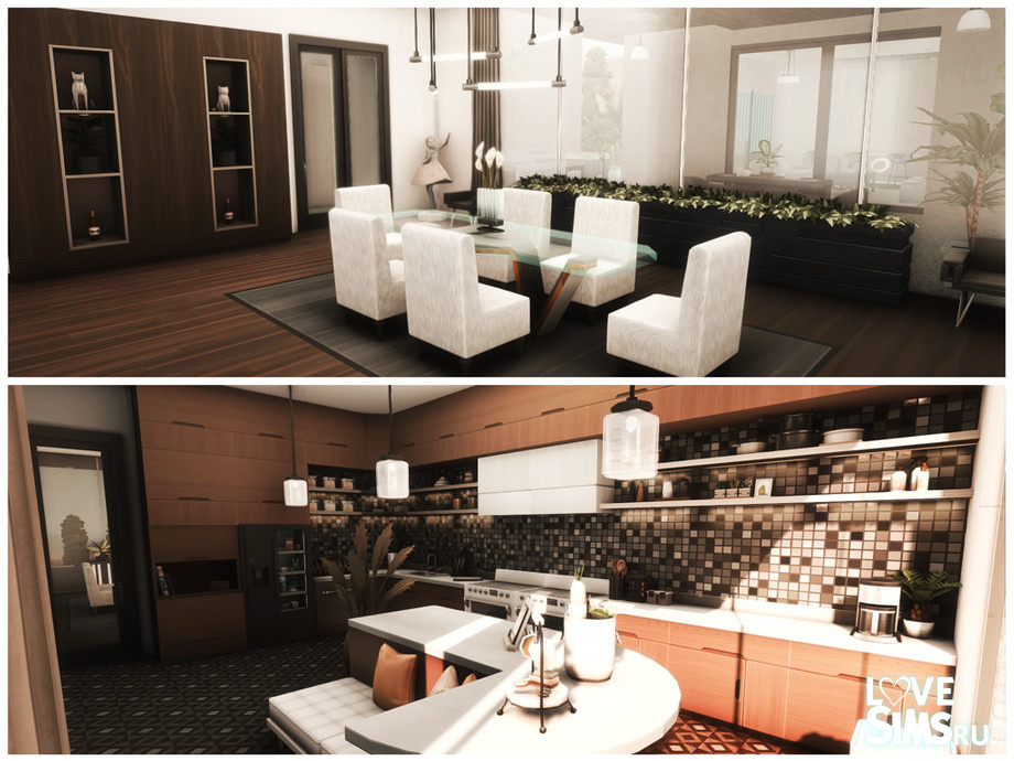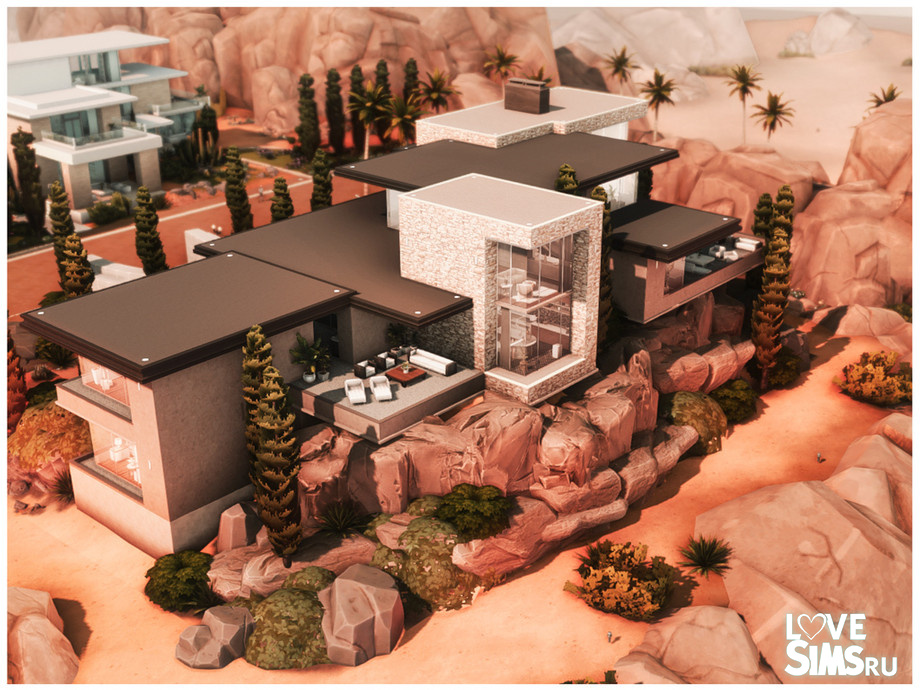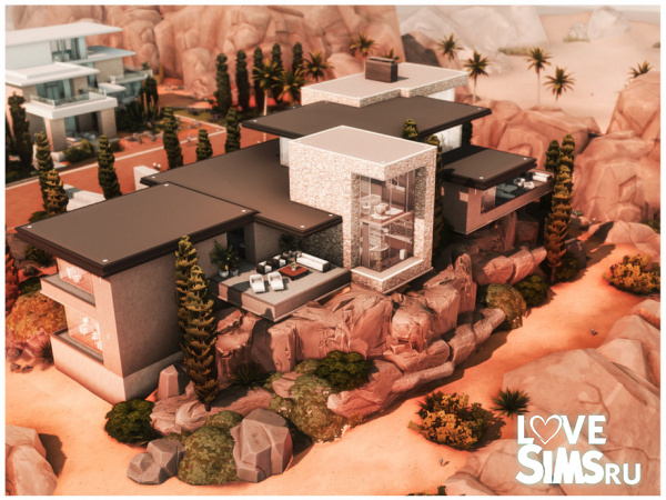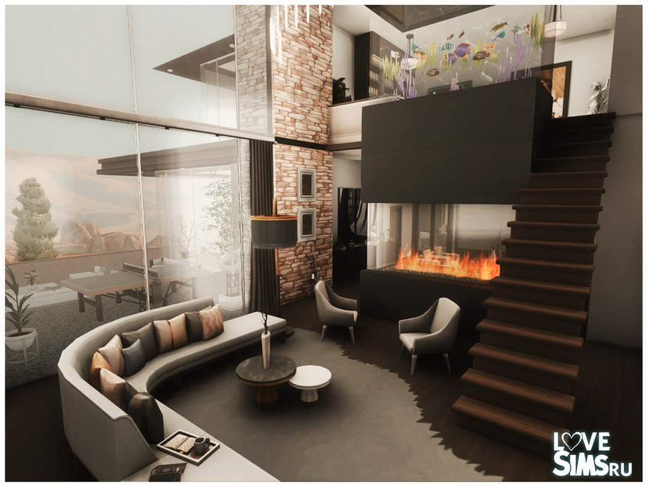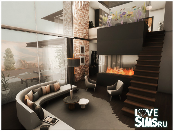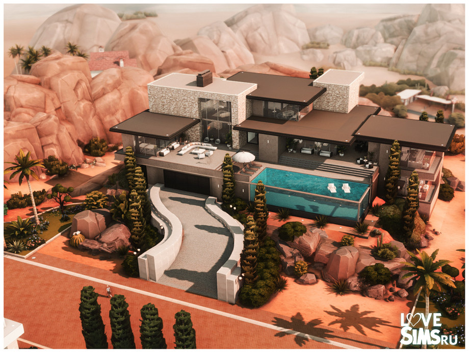 Современный загородный дом, расположенный на фоне живописного горного пейзажа. В доме находится длинный бассейн с прозрачными бортами. На первом уровне, над гаражом, находится терраса с эксклюзивной зоной отдыха, включающей круглый диван и несколько белых стульев. На втором уровне, слева от террасы, также расположены зоны отдыха с диванами и столиками.