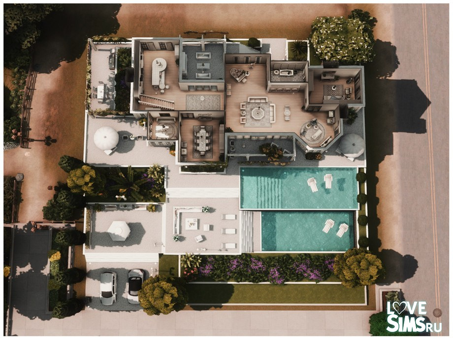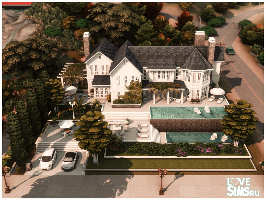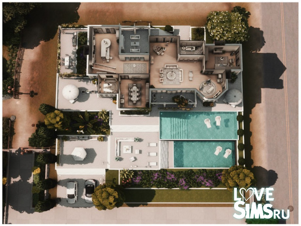 Большой двухэтажный дом с большим количеством зелени, включая деревья различных размеров и кустарники. Перед домом есть терраса с садовой мебелью и двумя бассейнами, расположенными один над другим на разных уровнях. В бассейнах плавают белые шезлонги. Размер участка 40X40.