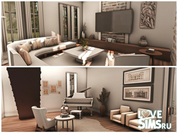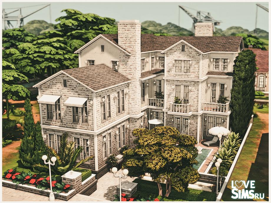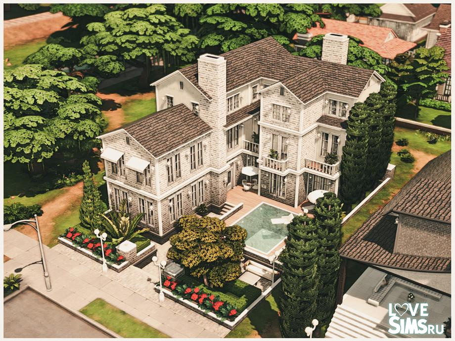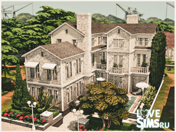 Трехэтажный дом украшенный каменной отделкой, окружён ухоженными газонами и клумбами. Во дворе есть бассейн с шезлонгами и зонтами для отдыха. Размер 30X20.