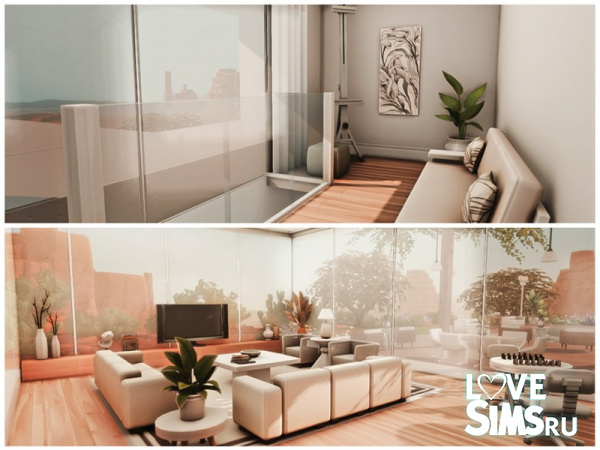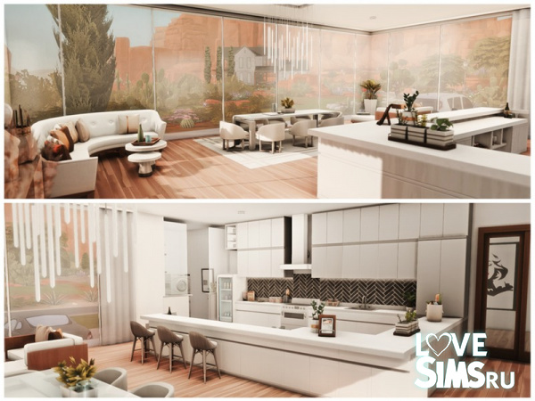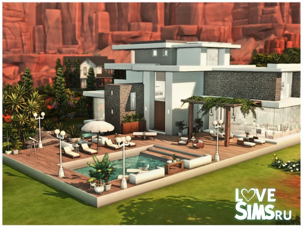 Дом с бассейном, расположенный на фоне скал, имеет плоскую крышу, белые и серые стены, а также вставки из камня. Перед домом находится большая деревянная терраса. Размер участка 40X30.