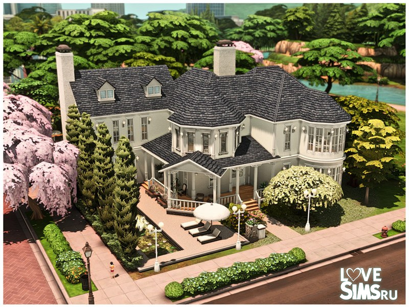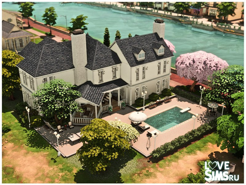 Просторный дом с двумя этажами и плавательным бассейном в задней части участка. Размер участка 40X30.