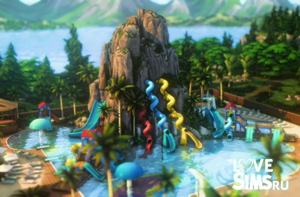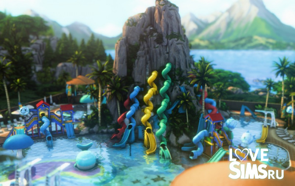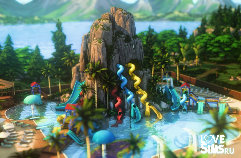 Откройте для себя роскошный аквапарк! Вас ждут захватывающие горки для любителей адреналина и весёлая детская зона с мини-горками. Идеальный отдых для ваших симов!