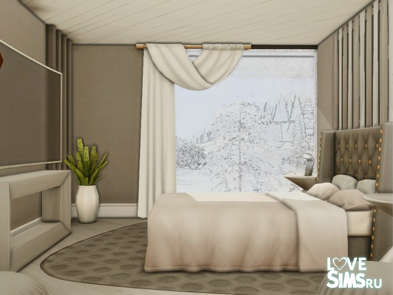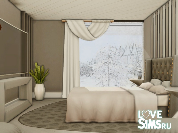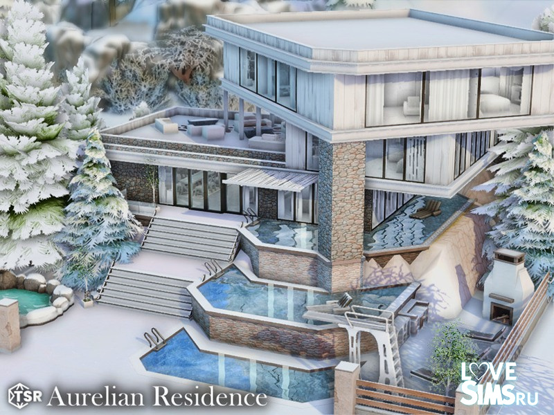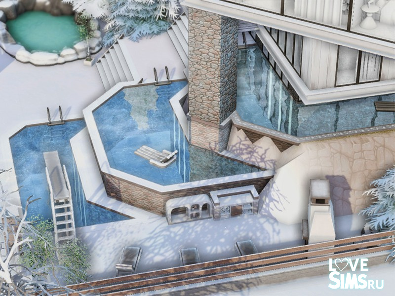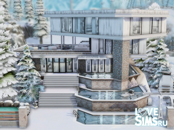Современный многоуровневый дом с роскошным дизайном, окруженный зимним пейзажем и оснащенный бассейнами. Размер участка 40x30.