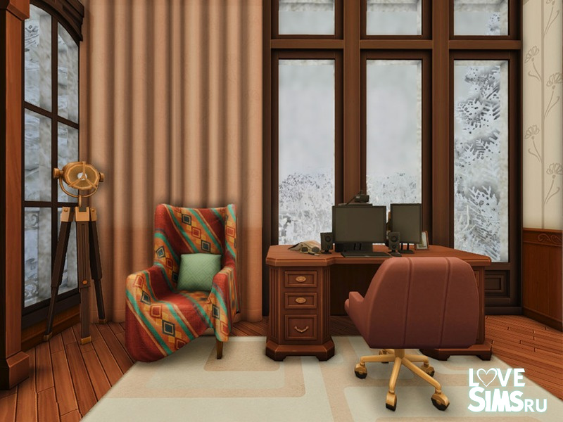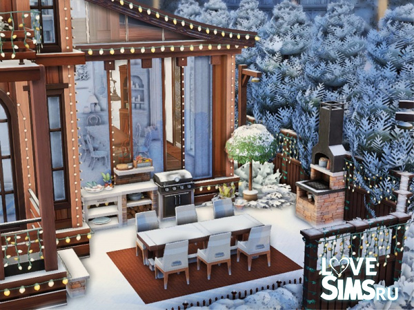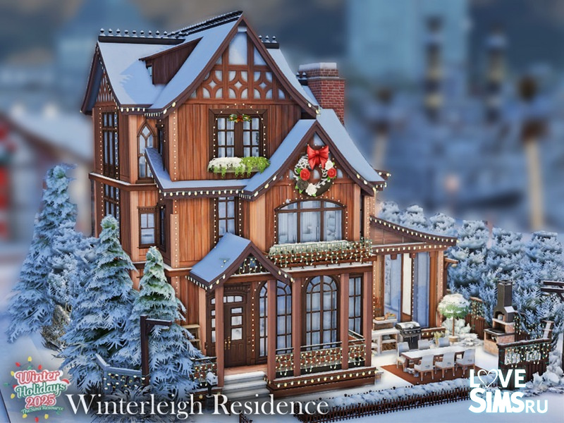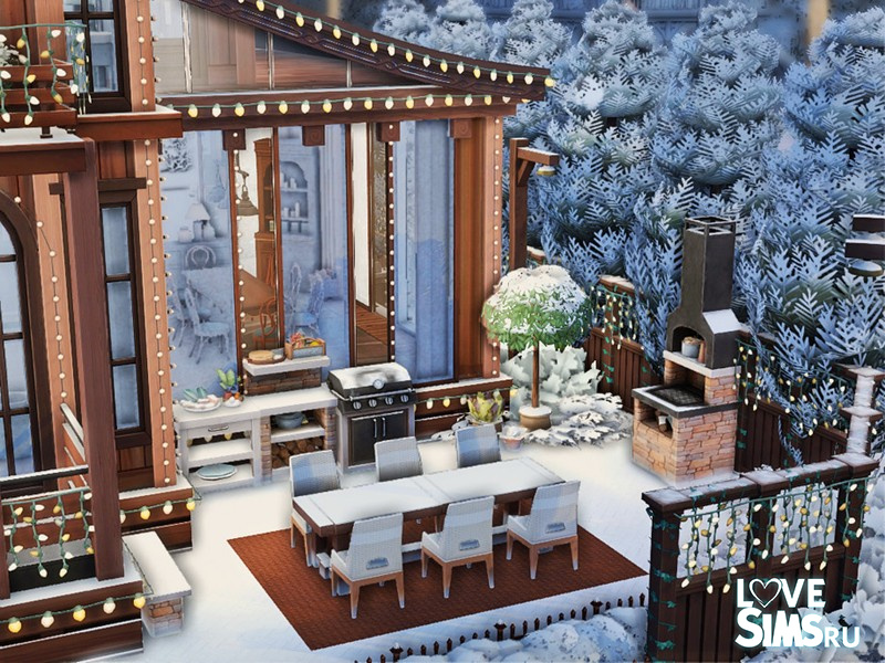 Трехэтажный деревянный дом, стилизованный под шале, украшенный к зимним праздникам. Крыша покрыта снегом. По периметру крыши и балконов развешаны гирлянды из маленьких лампочек. Размер участка - 20х20.