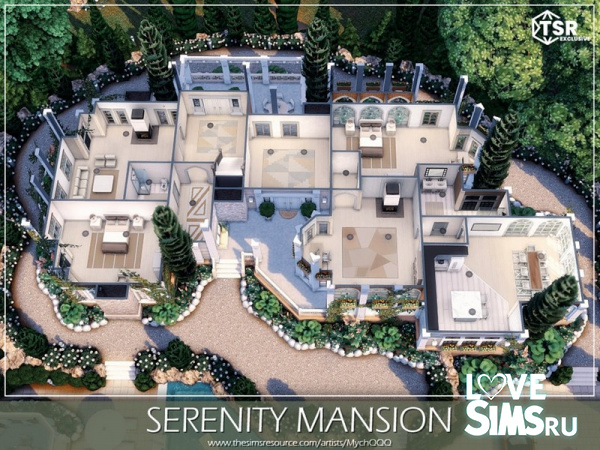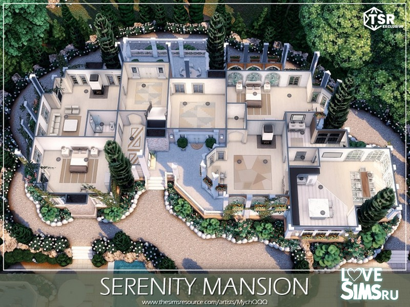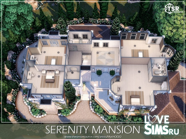 Особняк имеет сложную архитектуру, включающую несколько крыльев, балконов и террас. Размер участка: 50x50.