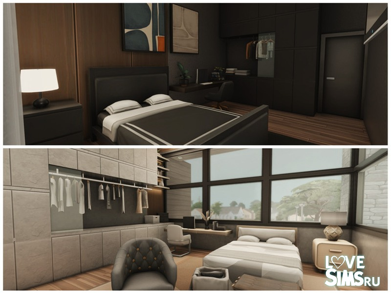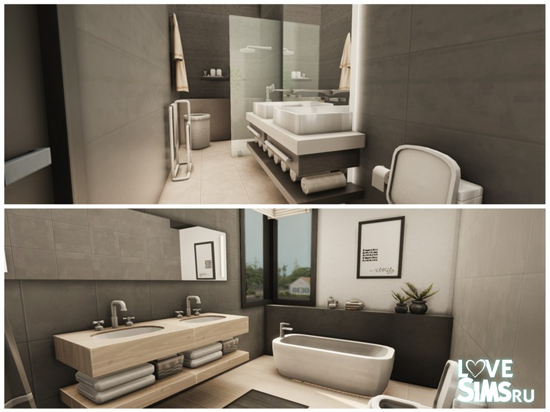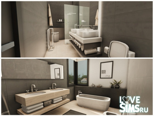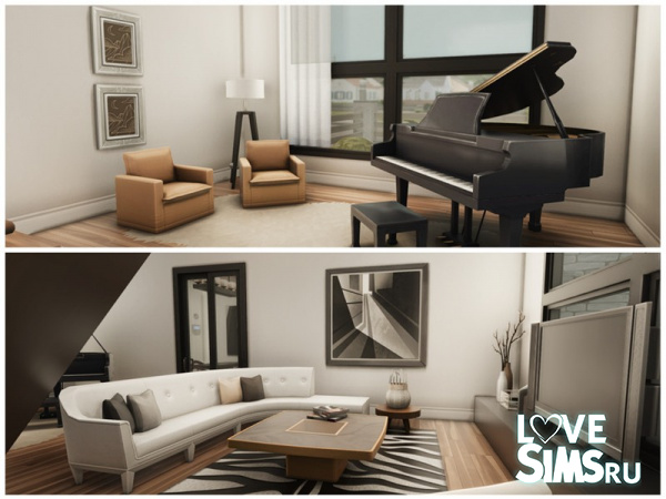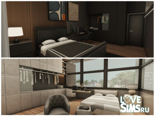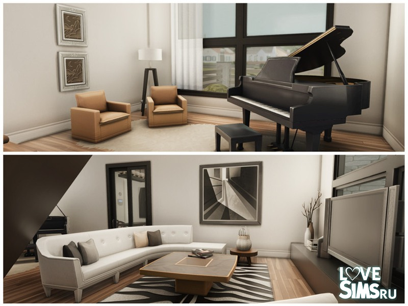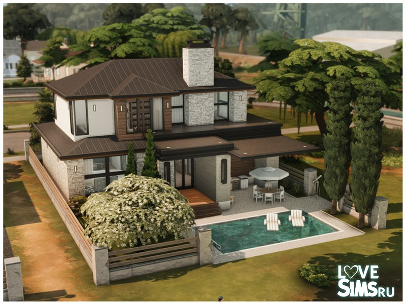 Современный двухэтажный дом, окруженный ландшафтом. У дома коричневая крыша, белые стены и каменная отделка. На первом этаже расположен навес для автомобиля. Размер участка 30X20.