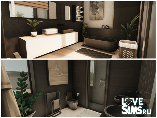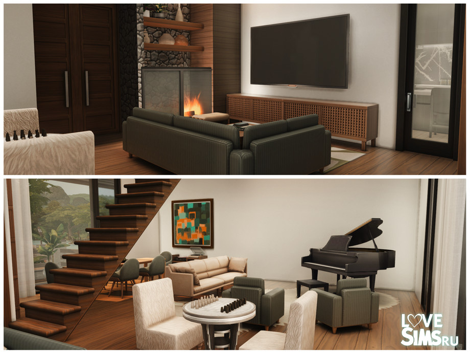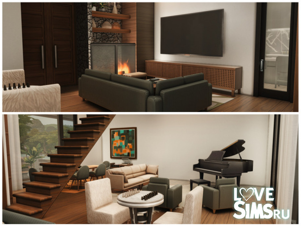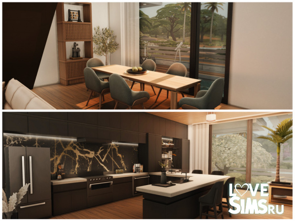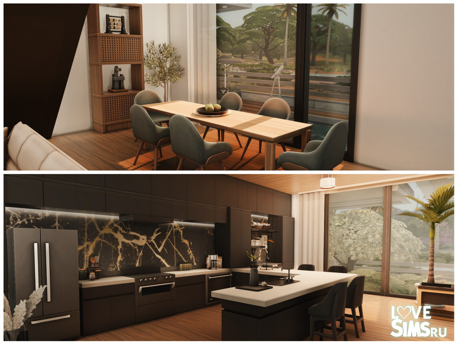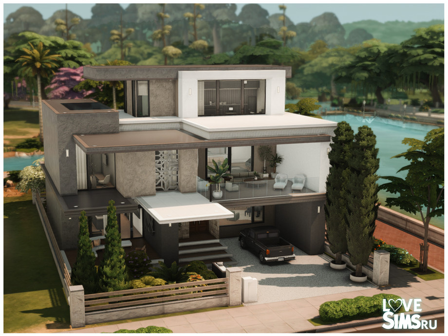 Современный трехэтажный дом с плоской крышей. Дом расположен в окружении зеленых деревьев и реки. Размер участка 30X20.