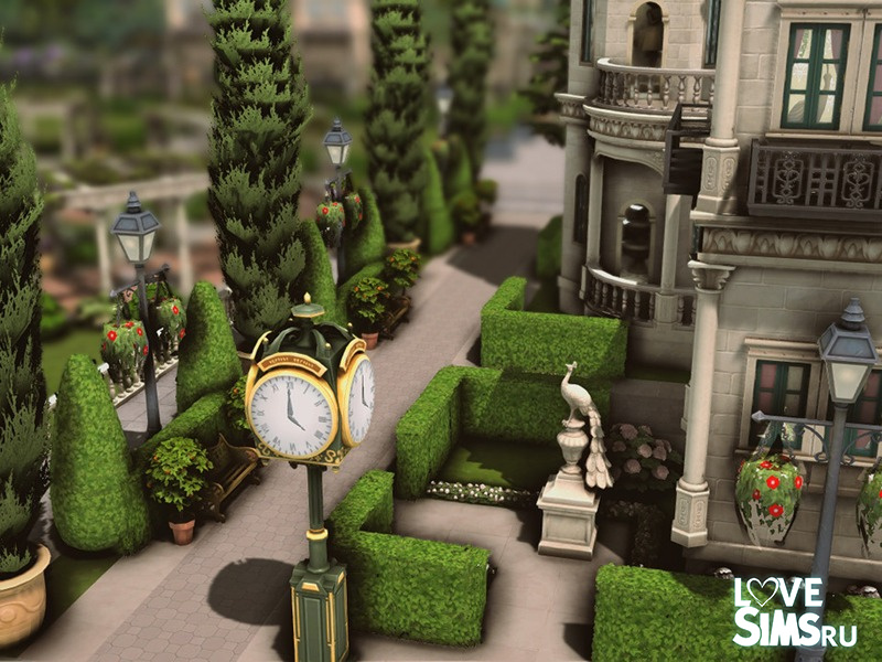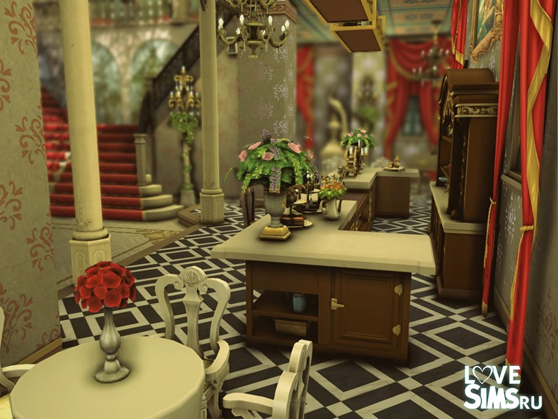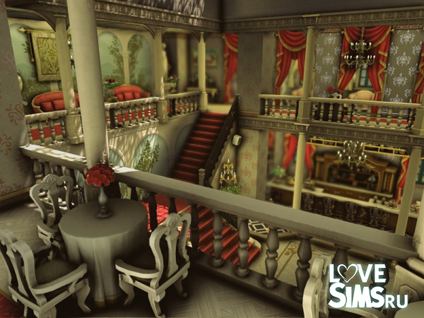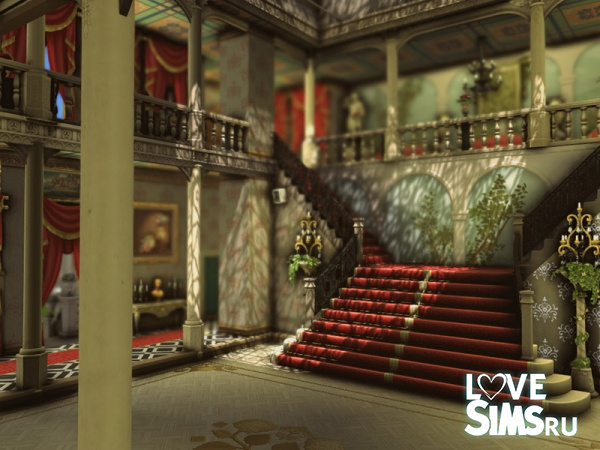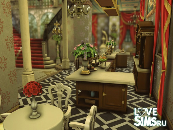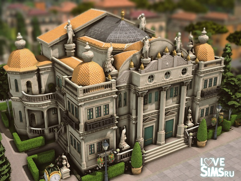 Этот бальный зал, выполненный в эклектичном стиле, поражает гармоничным сочетанием классики и барокко, создавая богатую и впечатляющую архитектурную композицию. Золотые купола контрастируют со светлой каменной конструкцией, а декоративные скульптуры придают зданию элегантность и театральный колорит. Симметричный фасад с монументальными колоннами и богато украшенными балконами усиливает ощущение величия и изысканности. Размер участка 40х30.