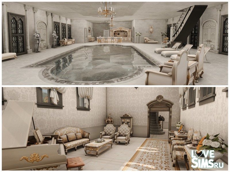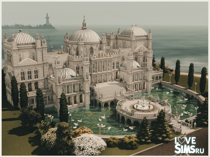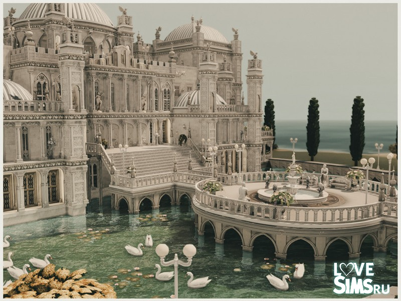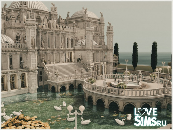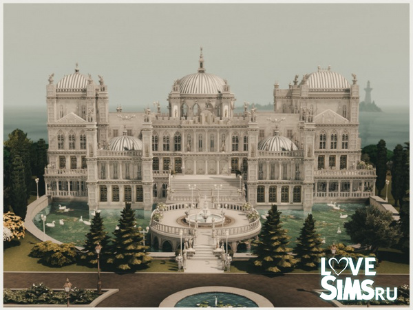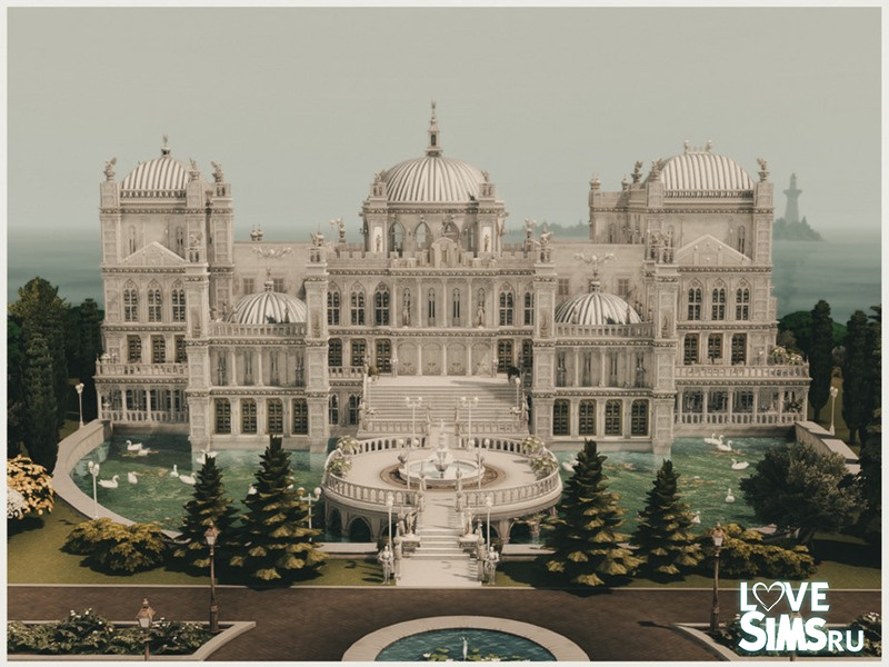 Величественный дворец, который окружает безупречный парк с аккуратно подстриженными газонами, деревьями и кустарниками. Водоем окружает часть здания, в нем плавают белые лебеди. В центре водоема находится круглая платформа с фонтаном и статуями. Размер участка 64X64.