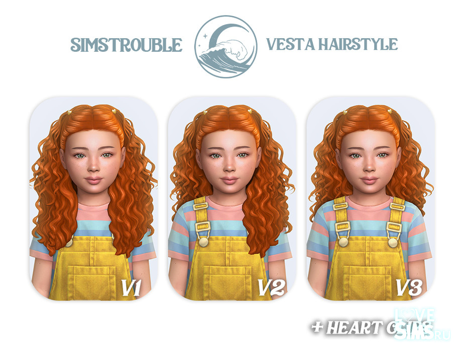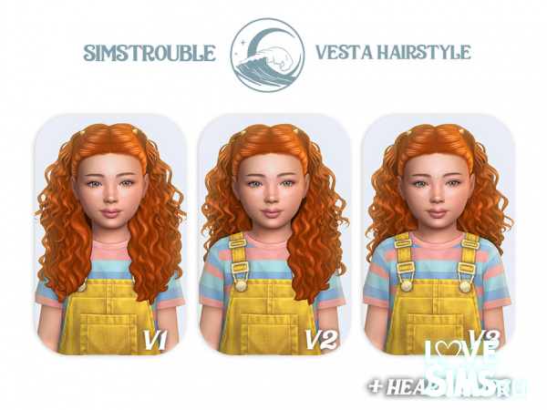 Длинная вьющаяся прическа с двумя съемными заколками, которые убирают волосы с лица вашего сима. Доступно три версии. Представлено 24 образца.