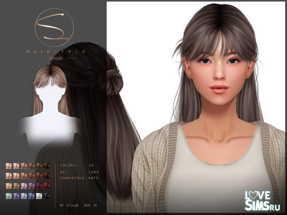 Красивые удлинённые волосы с челкой, представлен в 24 оттенках, совместима с головными уборами. Оригинальное название S-Club 051025 cute long hairstyle.
