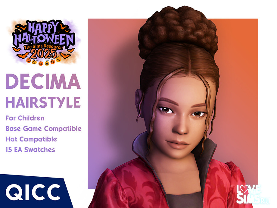 Небрежная прическа с высоким пучком для девочки, представлено 15 образцов. Совместима с базовой игрой. Оригинальное название Decima Hair от qicc.