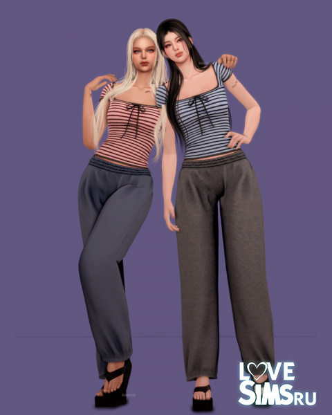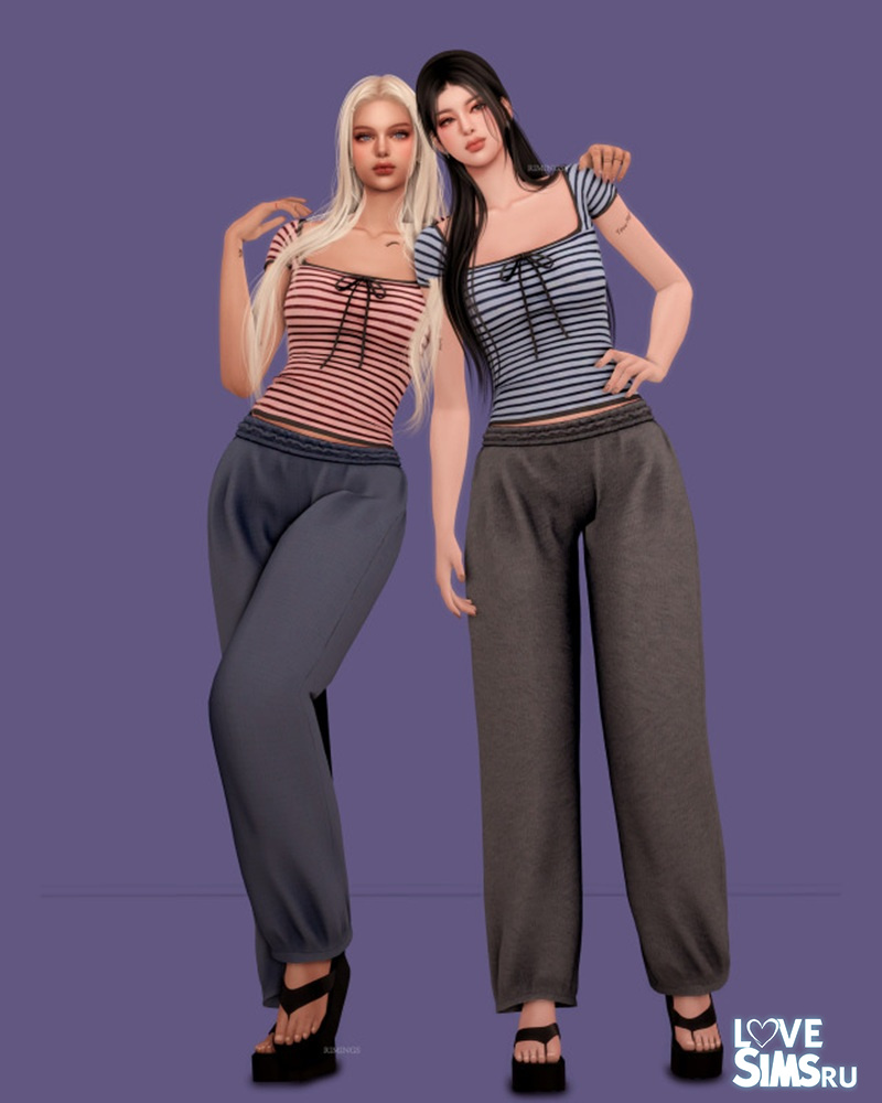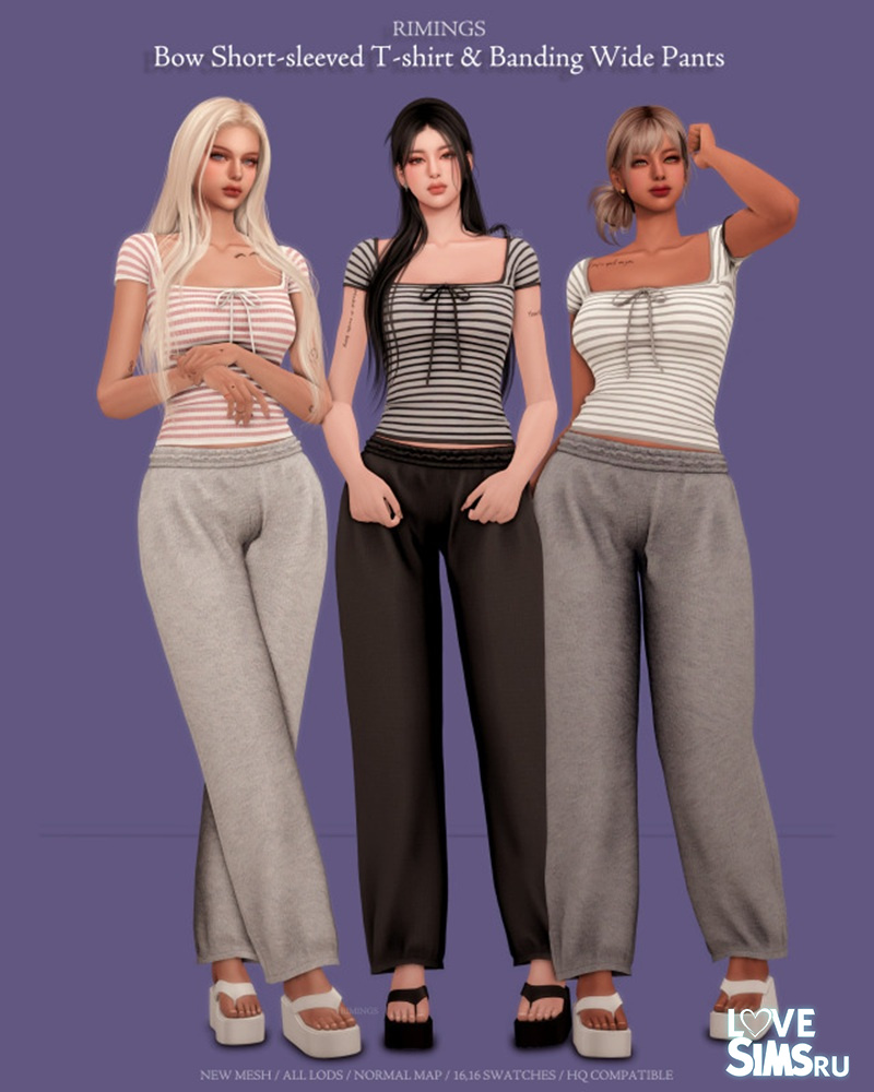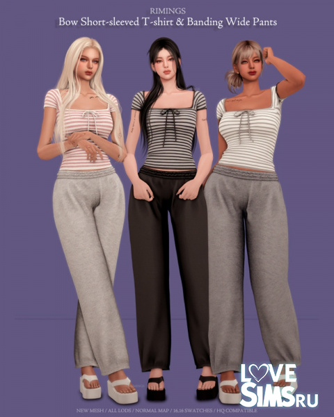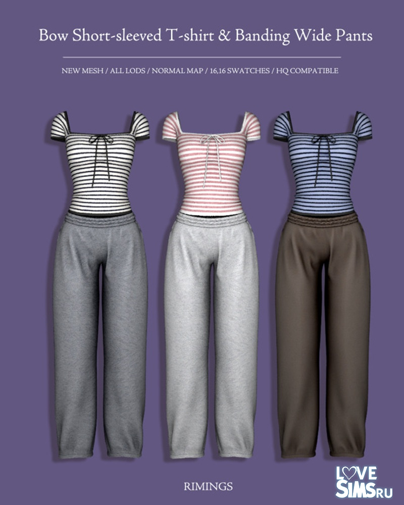 Домашний набор состоит из футболки с короткими рукавами, украшенной бантом, а также просторных брюк с декоративной окантовкой. Оригинальное название Bow Short-sleeved T-shirt & Banding Wide Pants от RIMINGS.