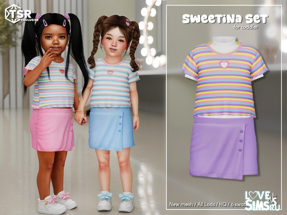 Этот очаровательный наряд для малышей состоит из модного укороченного топа в сочетании с игривой асимметричной юбкой. Доступен в шести ярких цветах. Оригинальное название Sweetina Clothing Set от WisteriaSims.