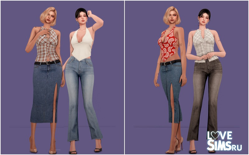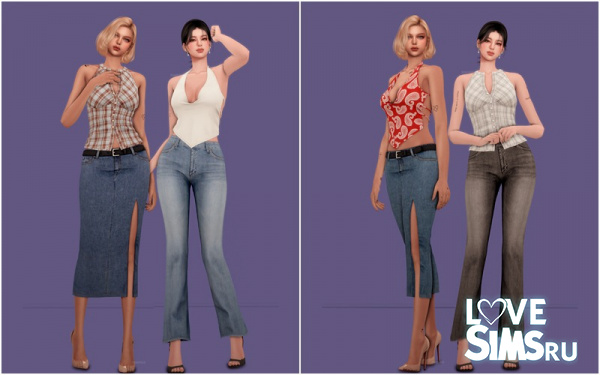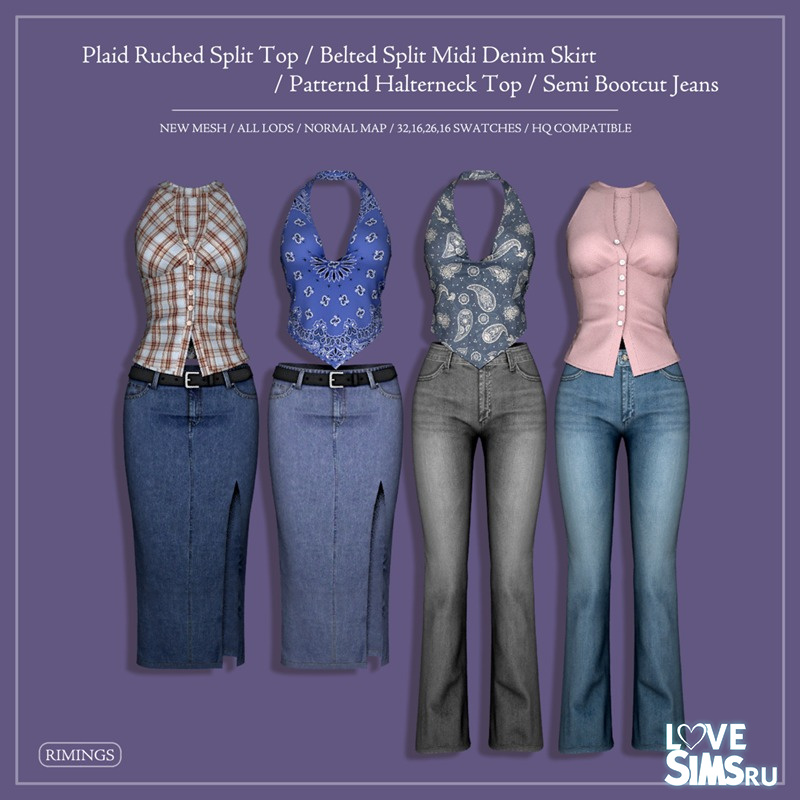 В этот комплект входит клетчатый топ, узкая джинсовая юбка с разрезом, облегающие джинсы и топа с завязками вокруг шеи. Оригинальное название Plaid Ruched Split Top / Belted Split Midi Denim Skirt / Patternd Halterneck Top / Semi Bootcut Jeans от RIMINGS.