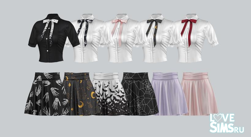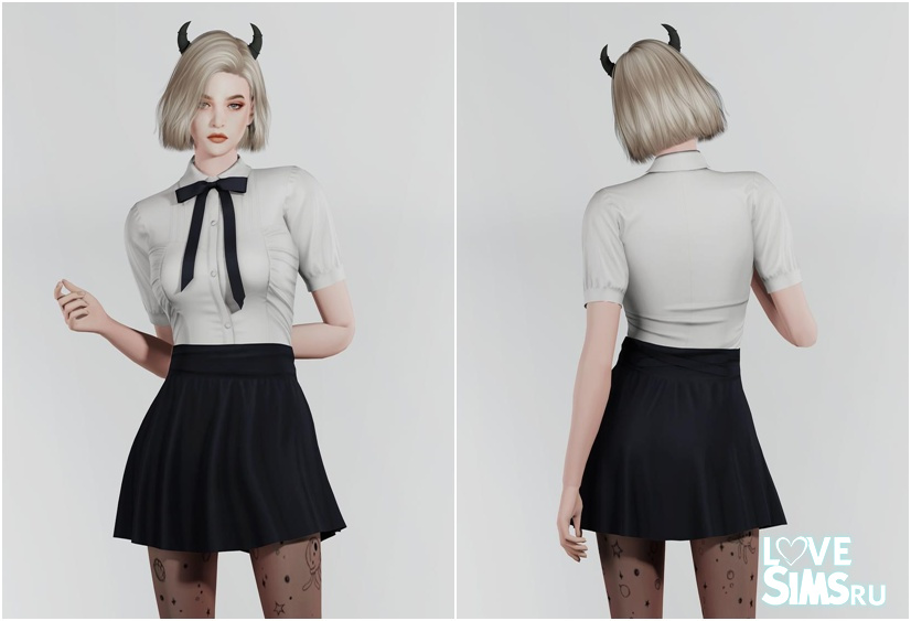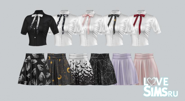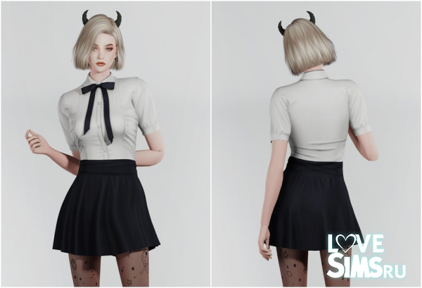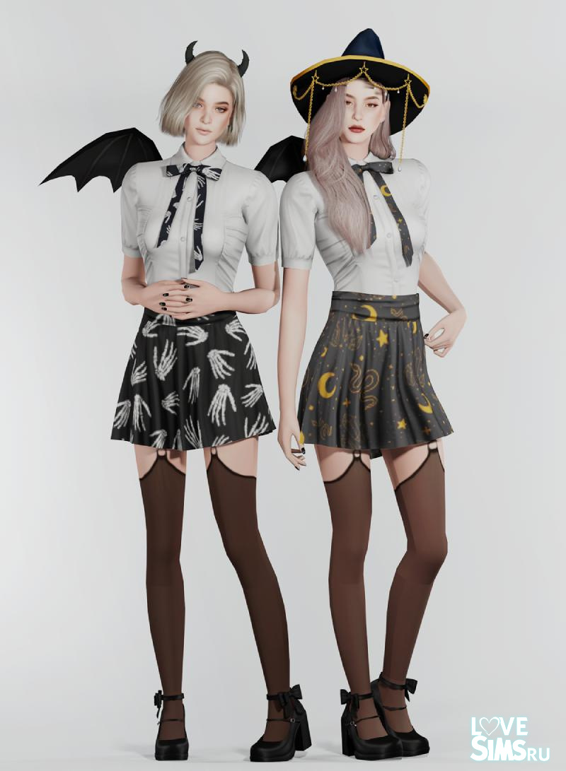 Костюм для Хэллоуина для симочек, включающий два элемента: стильную рубашку с бантом в виде галстука и короткую юбку. Предлагается в 15 различных цветовых вариантах.