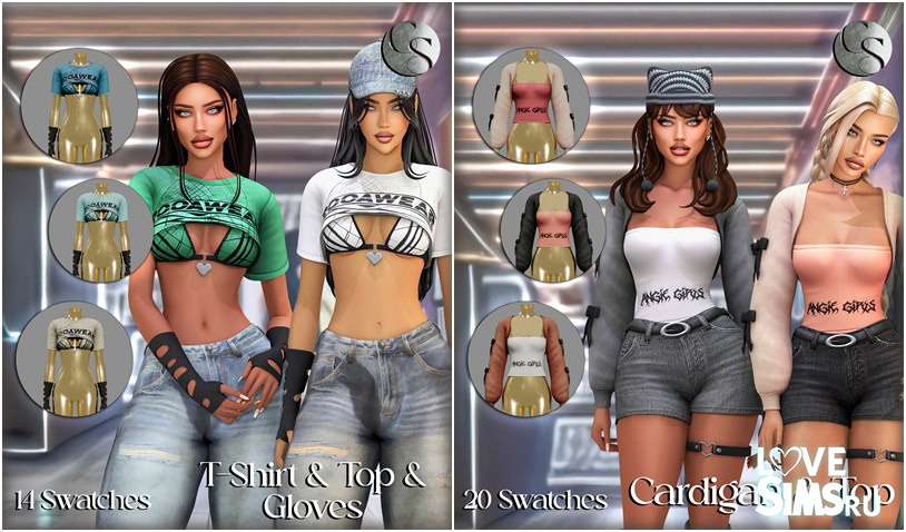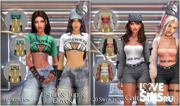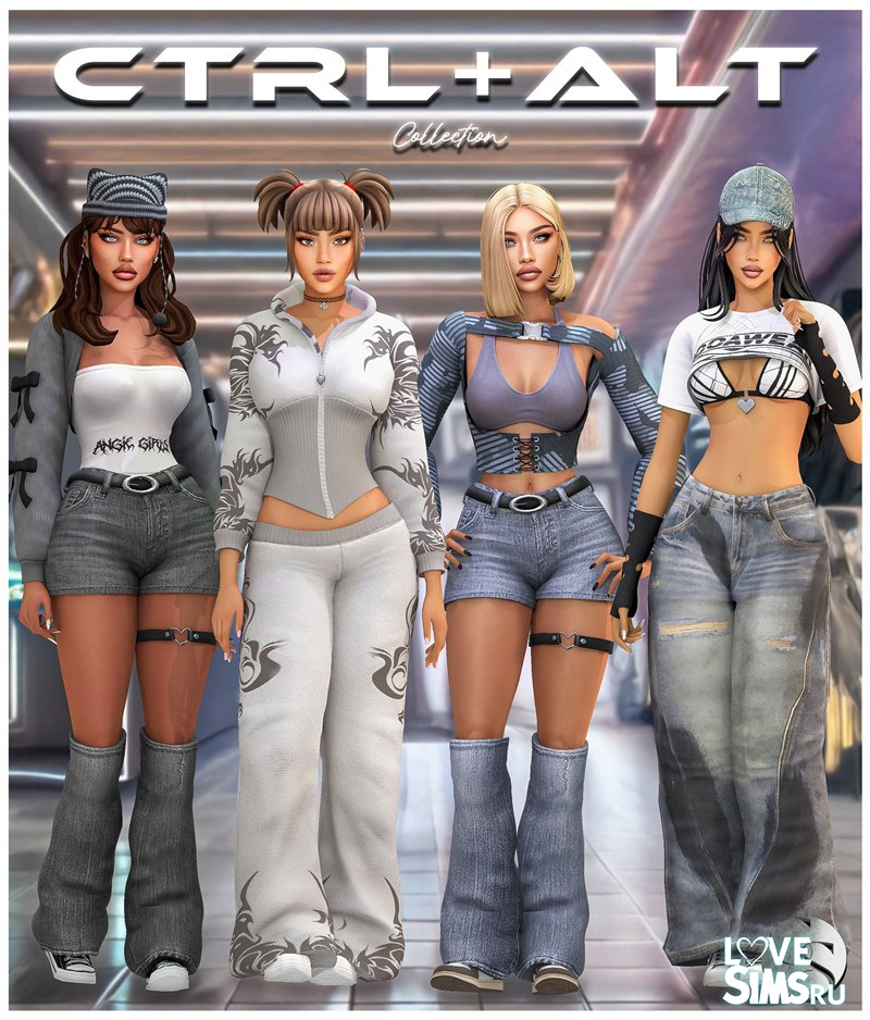 Большая коллекция, вдохновленная стилем y2k, включает в себя толстовку и спортивные штаны (игровое снаряжение), кардиган и топ, майку с безрукавкой и укороченную футболку, перчатки, укороченные шорты, джинсы, шапку, кепку-бейсболку.