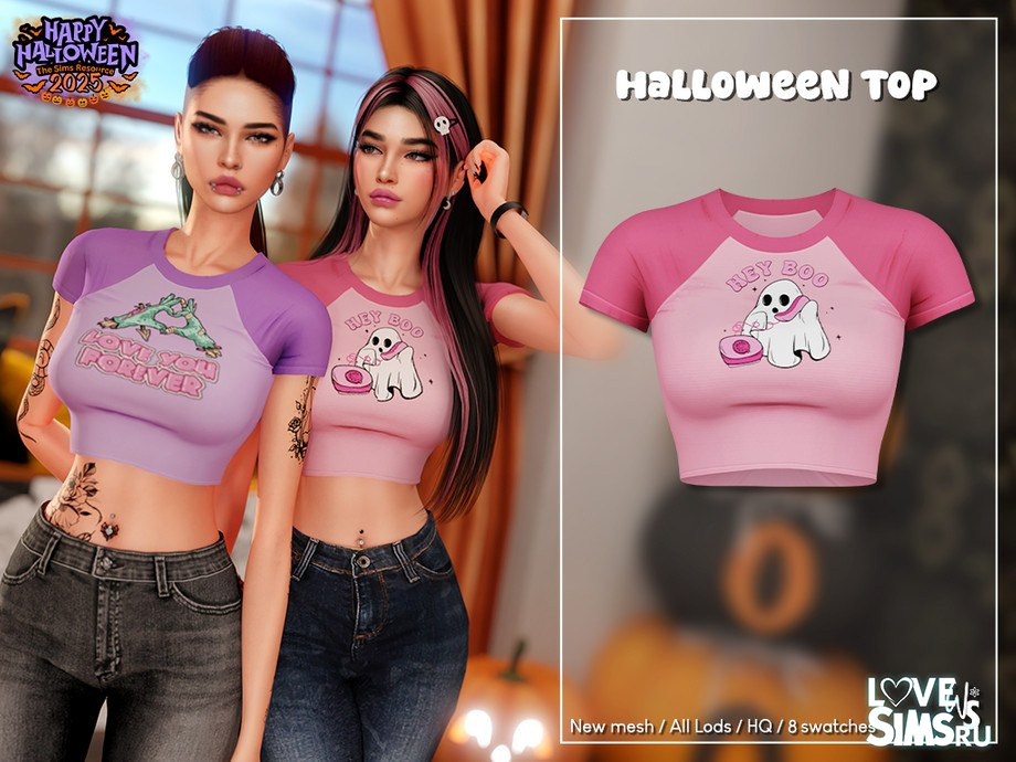 Симпатичная футболка с принтом на Хэллоуин доступна в 8 цветах. Оригинальное название Halloween Print Top от WisteriaSims.