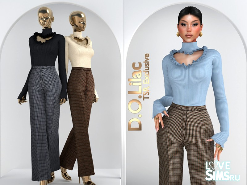 Элегантный комплект для симочек состоит из облегающего свитера с вырезом в форме сердца, отделанным рюшами и широкие брюки с высокой талией.