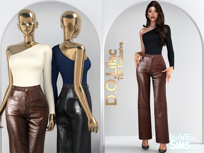 Изысканный комплект из двух отдельных предметов: просторные из кожи штаны, доступные в пяти различных оттенках, и асимметричный топ с одной открытой рукой, представленный в двенадцати цветовых вариациях.