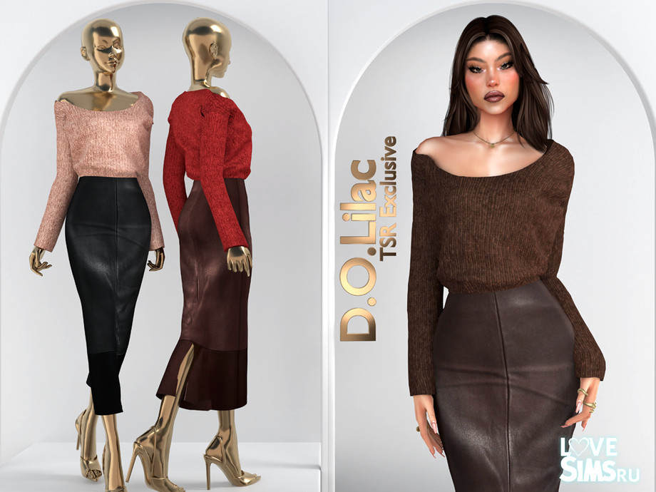 В этот элегантный набор входит мягкий вязаный верх с округлым вырезом и облегающая кожаная юбка миди. Доступно в десяти цветовых вариациях.