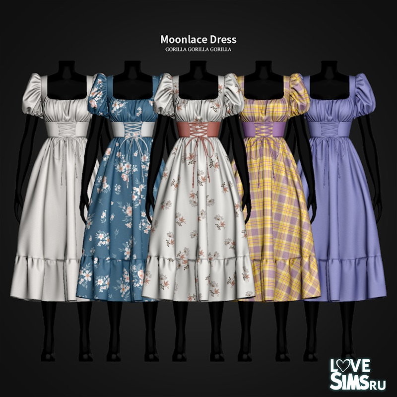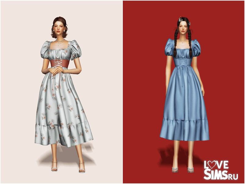 Платье длиной до середины икры с угловатым декольте и пышными рукавами, линия талии выделена широким корсетом, затягивающейся шнуровкой спереди. Доступно 40 расцветок.