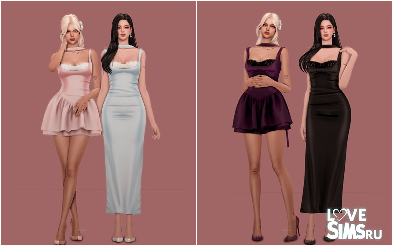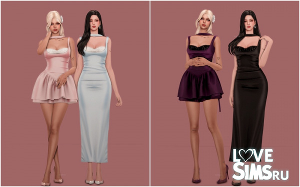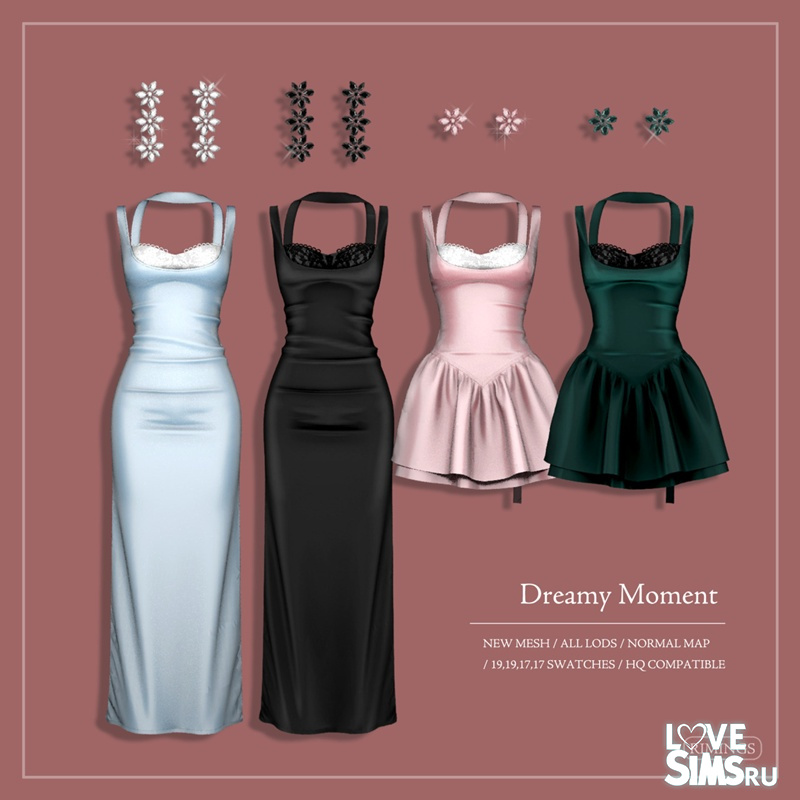 Коллекция содержит макси‑платье с кружевной отделкой, короткое платье с объемной (пышной) юбкой и две пары серёжек, выполненных в форме цветов.