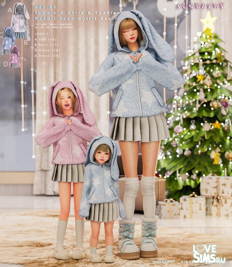 Худи с капюшоном и кроличьими ушками в наборе с короткой плиссированной юбкой. Представлено для малышей, тоддлеров и взрослых симов.