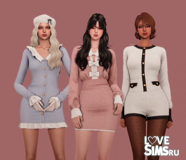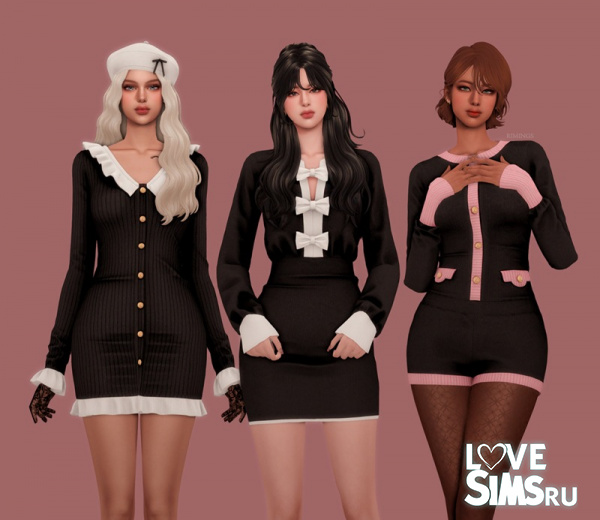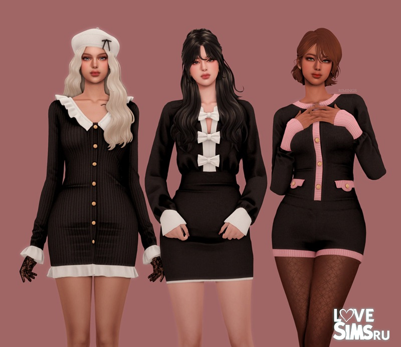 Вашим симкам доступны три шикарных образа, выдержанных в классическом контрасте черного и белого цветов. Ассортимент включает: изящное платье с рюшами и воротником, второй вариант платья, украшенный декоративными бантиками, и модный короткий комбинезон.