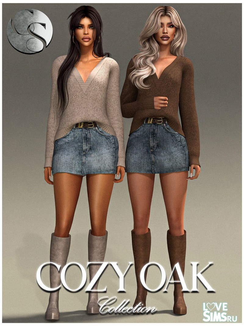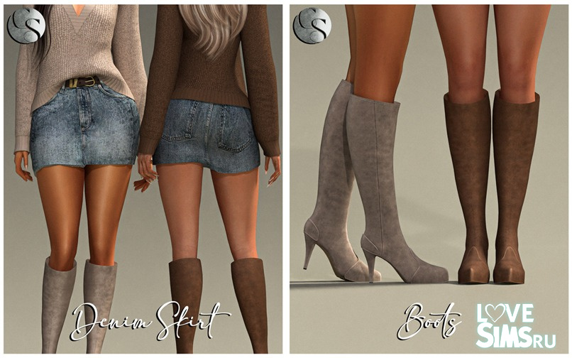 Эта милая коллекция включает в себя: вязанный свитер, джинсовую юбку и замшевые сапоги.