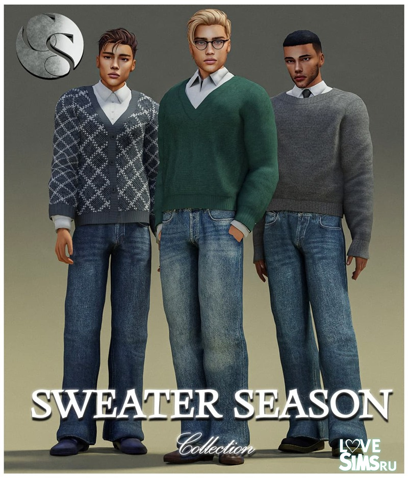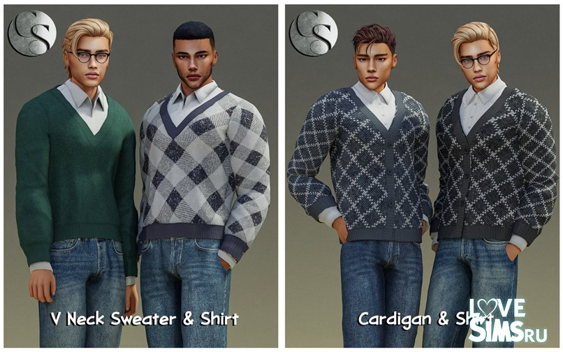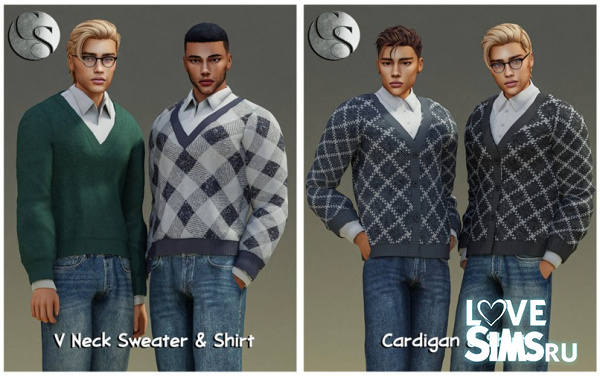 В эту мужскую коллекцию входят: свитер и рубашка с V-образным вырезом, кардиган и рубашка, свитер и рубашка, одинаковые джинсы с 2 разными текстурами.