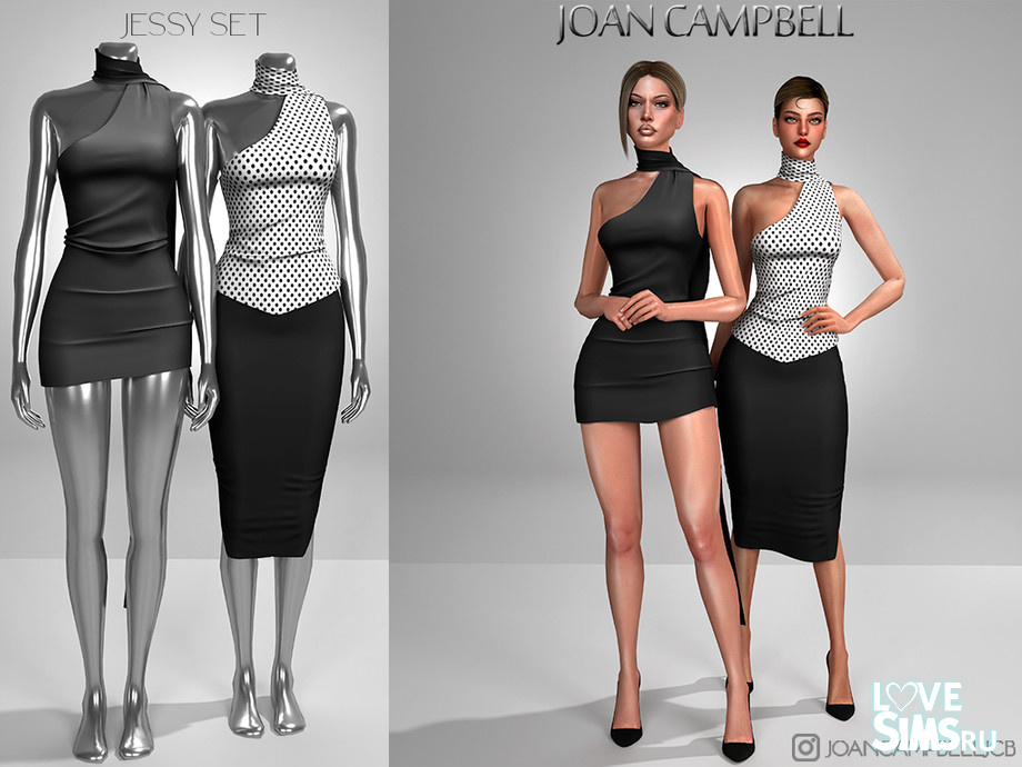 Этот комплект представляет два изысканных варианта: один включает облегающую юбку-карандаш в паре с асимметричным топом на одно плечо, а второй короткое платье с акцентом на открытое плечо.
