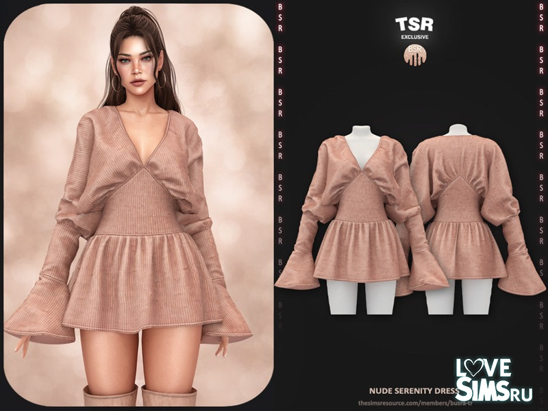 Романтическое платье-мини для симочек, выполненное в 10 универсальных нюдовых цветах. Характеризуется эффектными расклешенными рукавами.