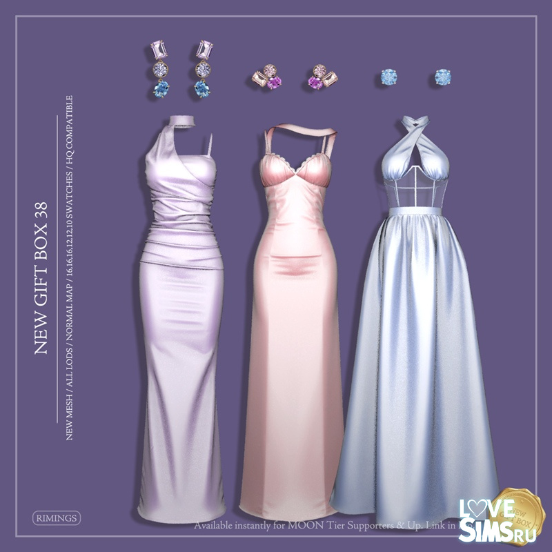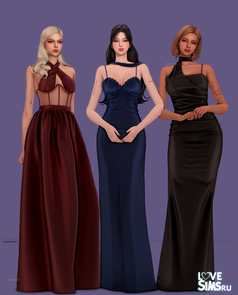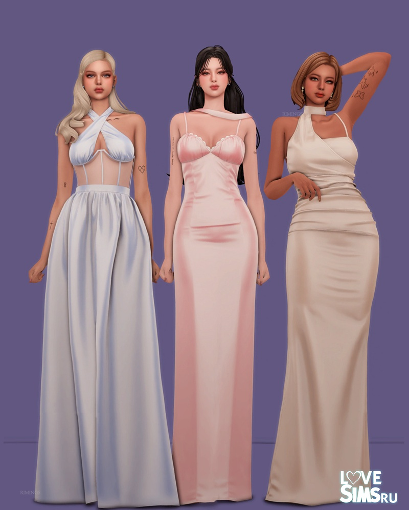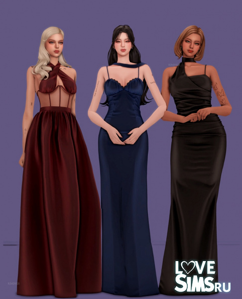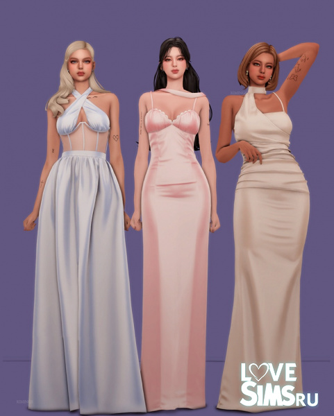 Три вечерних платья в пол из шелка. В комплект к каждому платью входят дизайнерские серьги с драгоценными камнями.