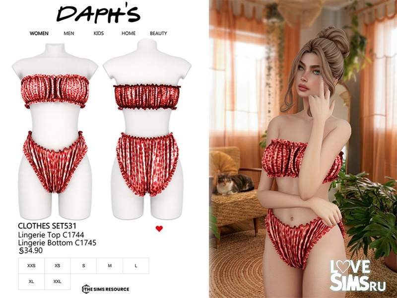 Нежный и стильный комплект нижнего белья с текстурированным верхом-бандо и подходящими по цвету низом с завышенной талией. Этот комплект с мягкими деталями и романтичным силуэтом привнесет в гардероб ваших симов уютную и элегантную нотку.